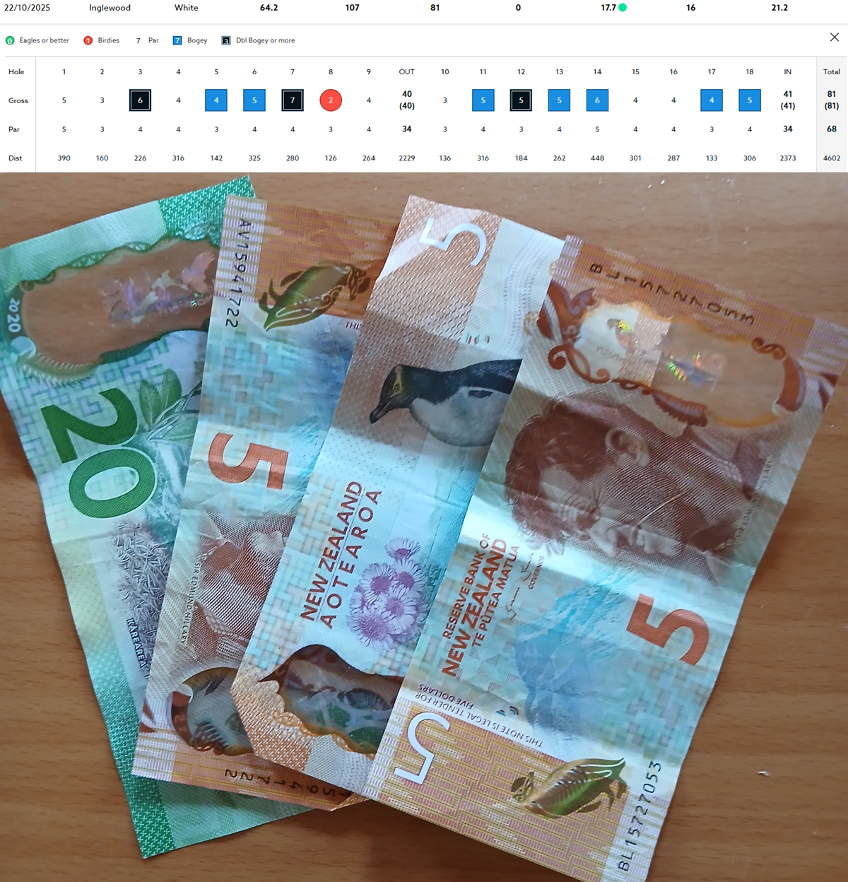 A total of 39 was a good score, and cost me 1.3 shots off my handicap. I left