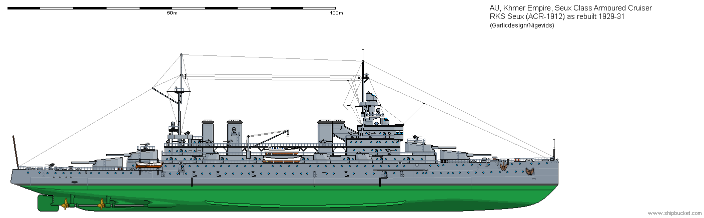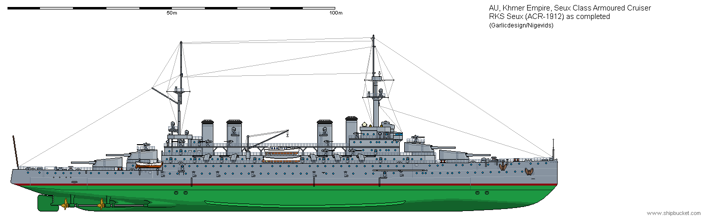 The Seux was the natural progression from the Aiphaya class cruisers. It was a one ship class as any sisters were deleted in favour of the Xiaowu class battleships. In the Khmer Navy this ship was always classed as a cruiser, titled as a Revenue Cruiser, as its main purpose was guarding and intercepting shipping using the Straits around Singapore for its tariff collections. From 1912 when the new term 'battlecruiser' was coined, Khmer continued to rate the ship as an armoured cruiser. Journals such as Janes Fighting Ships rated the Seux as a battlecruiser. The Seux was turbine engined and made its designed speed on a flat calm day with a following wind. The Seux and the two Aiphaya class made up the 1st (and only) Armoured Cruiser Squadron. At the start of World War One, the 1st Cruiser Squadron and the battlecruiser Cobra were held in the South China Sea in case Admiral Von Spee's cruisers came south. It was felt the 1st cruiser squadron and the Cobra would be more than enough to defeat Von Spee.