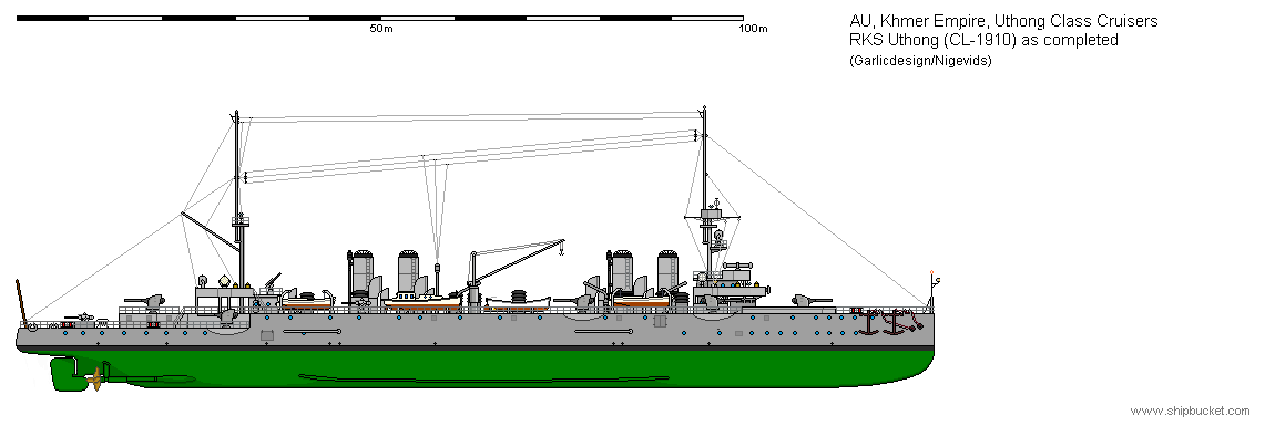The two Uthong class were typical broadside cruisers of the time. What differed from the French, German, and Royal Navy cruisers, which all had 6"/5.9" sized weapons, the Uthong had the same 5.5" guns as mounted on the Xiaowu class battleships, fitted with a shield. The smaller 84 pound shells were easier to load than the 100-110 pound shells in the bigger guns. Originally there were four 75mm anti-torpedoboat guns fitted. One on the bandstand in front of the mainmast was swapped out for a 75mm AA gun in 1917. All four had become 75mm AA guns by 1938. The one glaring omission from the ships was the lack of torpedo mountings either of surface or submerged tubes.