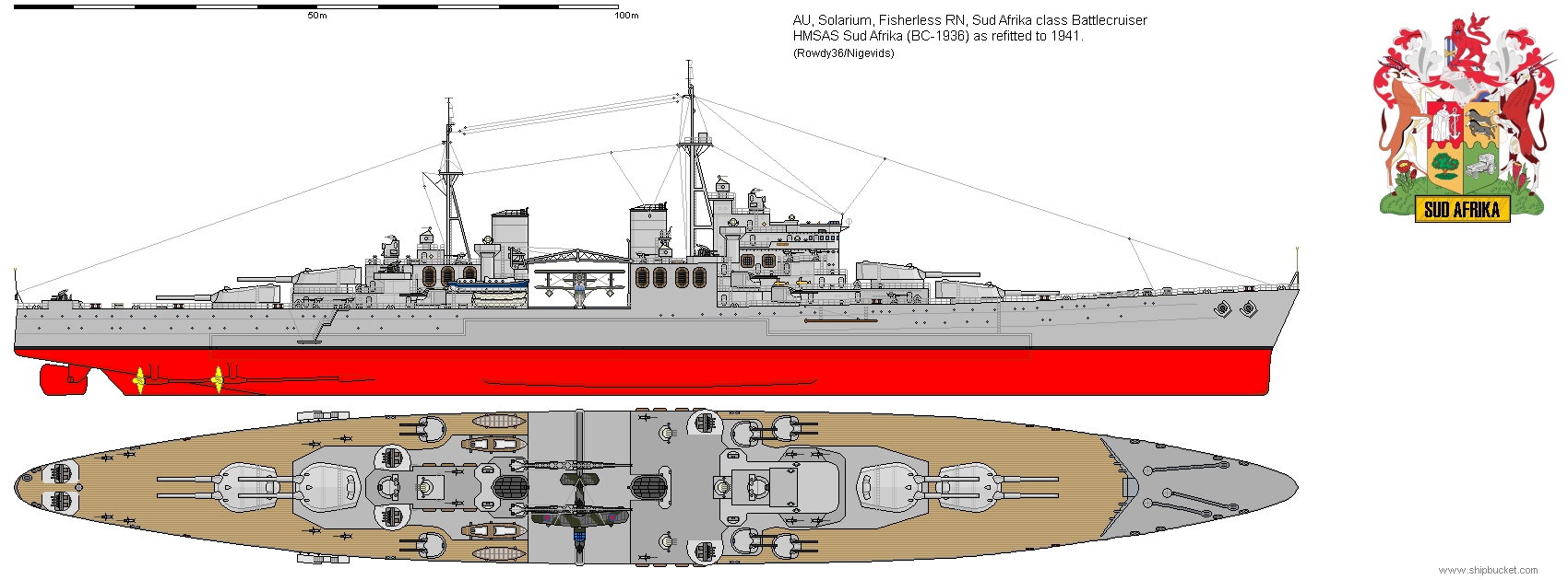 Based on the Lillicrap designs of 1930-32, the Southern African Navy enlarged the plans to suit their requirements. This was the first capital ship built by the fledgling Simonstown building yards and while being based on a Royal Navy design, the final ship had its own Southern African style. The 12" guns were the powerful new weapons designed for the Lillicrap BC's and proved excellent weapons in service.