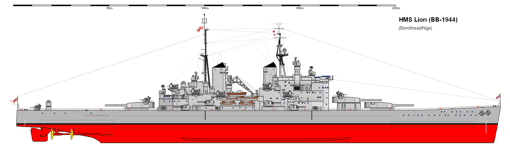The same hull and propulsion as used in Vanguard would be also used for the next Lion class battleships but these ships would be armed with 9x16" with the appropriate design changes made for the difference between 4 twin and 3 triple turret layouts. Below: 16" version.