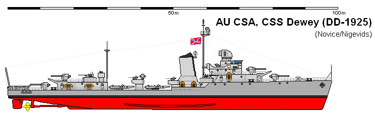First of the post-war destroyers. Like other navies the armament of two fore and two aft was standard for these vessels. This armament arrangement for destroyers was pioneered by the UK VW class DD's. The Confederate States navy built their destroyers in groups of four with two years of production giving a full flotilla. Additional flotilla leaders were not built as these ships were considered big enough to carry their own Captain D. Eventually the McKinley class DDL's were used with these vessels to create flotillas of 5 vessels.