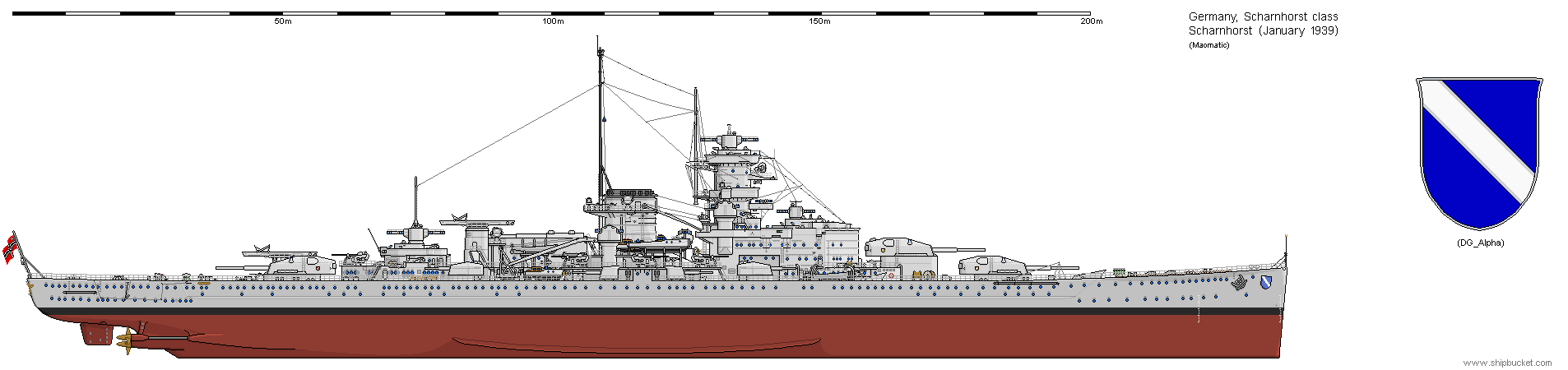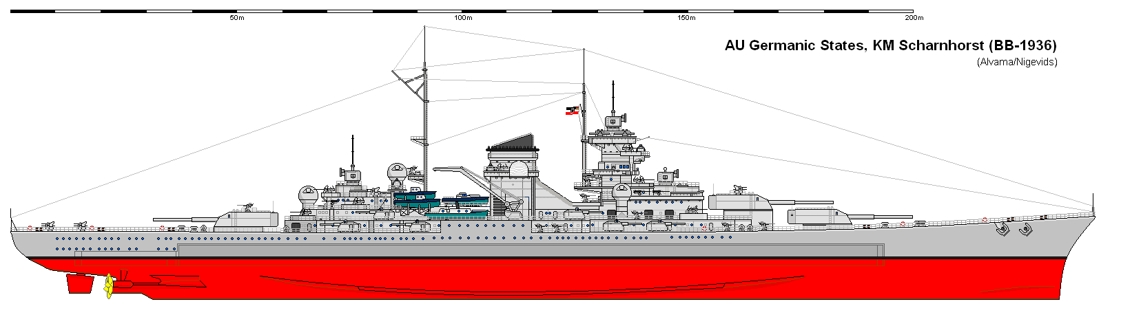 This version of Scharnhorst would only be built from a different AU stream. That would have the Mackensen type at end of WW1 with 8x13.8", then the next class would be a raider type with 8x13.8" in two quad turrets, with light armour. Then followed by this type of ship with 9x13.8" with much better armour. But that stream does not really take into account what the French would build in response to the raider type. A Dunkerque with 8x13" would not be good enough, so I uprate the French ships to 16"/35,000 ton Treaty battleships. The German reply to those has to be to the Treaty limit as well.