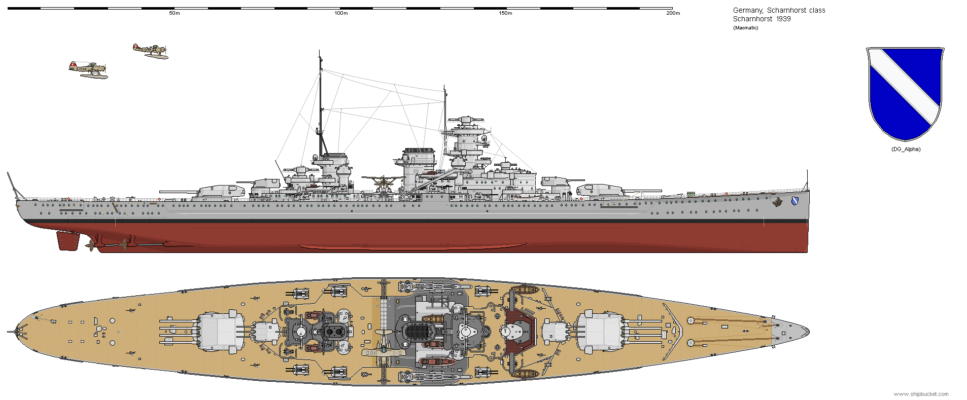 This two view drawing of a Scharnhorst version with two quadruple 13.8" mountings gives a different take on what might have been. An excellent AU drawing.