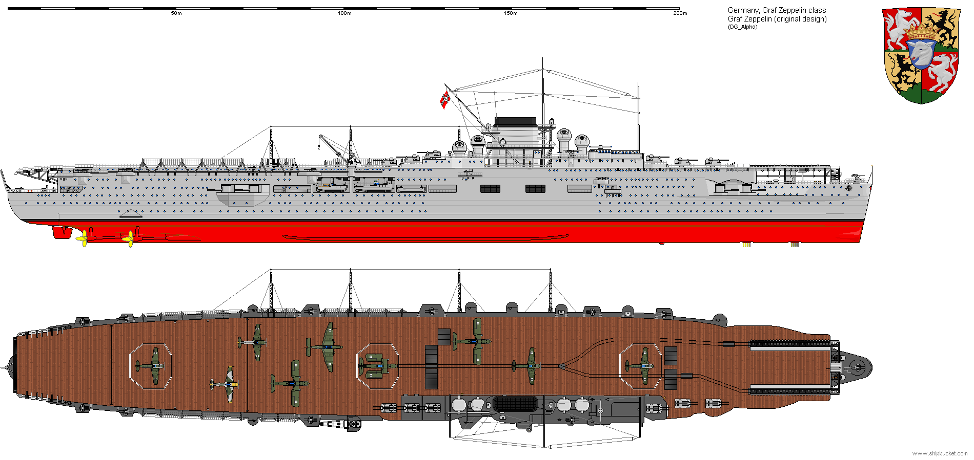 The Graf Zeppelin came from the expiry of the Naval treaties that had restricted the Germanic States in what they could build and how big it could be. The Graf Zeppelin was the Germanic States first try at building an aircraft carrier from the keel up, but their designers had not really taken in what was happening around the world. The only other experience they had had so far with aircraft carriers had been the ex-passenger liner conversion they had done for Argentina and the conversion of the Anhalt-Dessau. The open front flight deck configuration was quickly found to be of little use in heavy seas on the Anhalt-Dessau and an enclosed bow section was fitted to the design for the Graf Zeppelin during building. Removal of the casemate guns, reduce the number of directors, and downsize the bridge structure. A little bit of intelligence work would have noted that both the US, Japan and Great Britain, were all reducing and removing all of the 5.5" to 8" guns that had been fitted to their ships. To include single then twin 5.9" on the designs for the Graf Zeppelin just made the ship look very antiquated and wasted a lot of space that could have been better used to increase the aircraft complement, which was a bit on the low size for such a large ship.