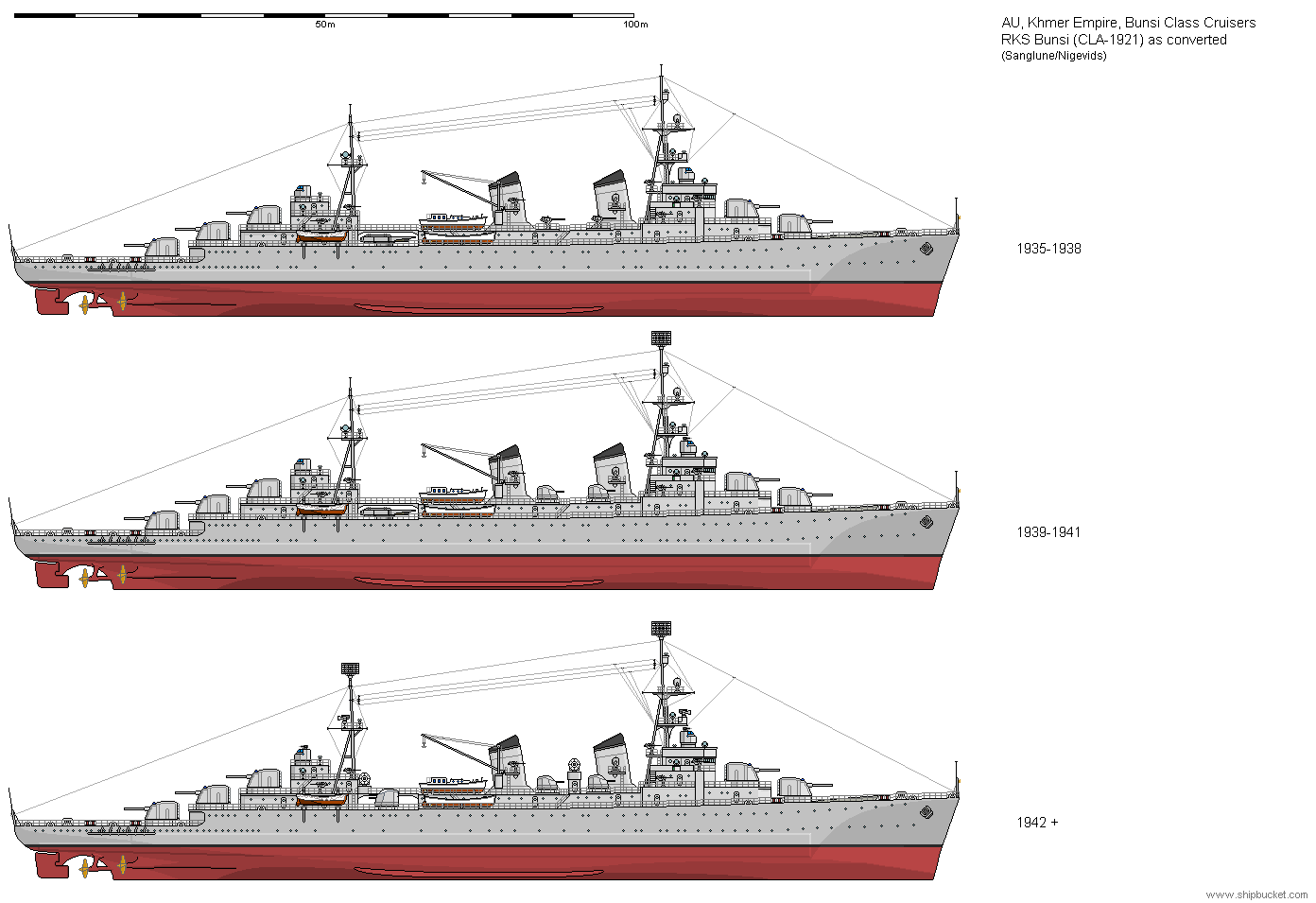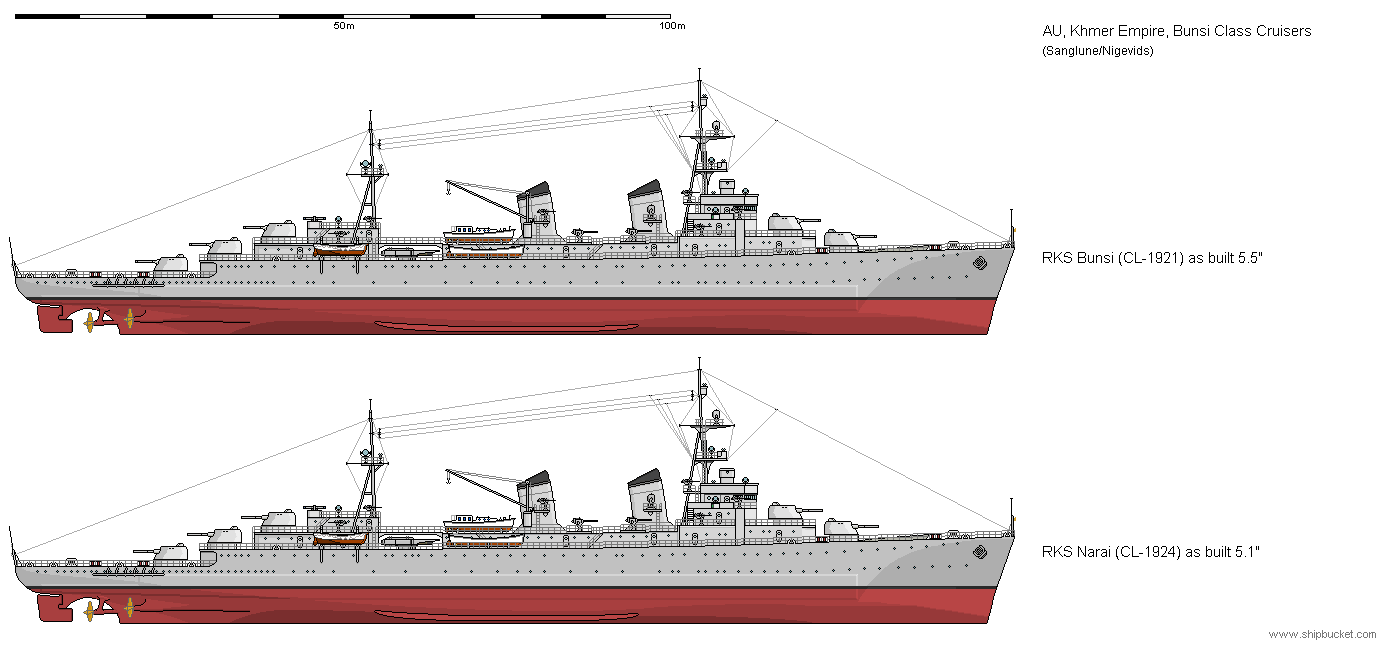 The six ship Bunsi Class came in two batches. The first, Bunsi, batch was armed with the 45 caliber 5.5" guns, the same as those fitted to the Sanphet Class. The second group featured the new 50 caliber 5.1" guns in the same twin turret but upgraded with a 50 degree elevation for barrage firing but was not a true dual purpose weapon. This twin turret debuted on the 1921 Krait class battlecruisers. The way to tell the difference between the two turrets, the 5.5" had a canvas shroud over the gun ports. These were built to be fast so they could act as flotilla cruisers when the need arose.