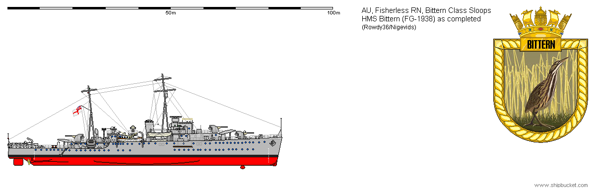 The Bittern and their follow ons, the Black Swan and Modified Black Swan classes, were a good blend of firepower and size. They were very good escorts. In the real world Commander Walkers escort group with Bitterns and Black Swans sunk more U-Boats than any other escort group. Really the only drawbacks to these ships was their low speed at 16.5 to 18 knots, and their need to be built in the Naval Dockyards because of their specialised parts. It was because of these problems the much more simple yet more capable River class frigates were put into production. One of the class had been modified as the Admiralty yacht for the Commander-in-Chief of the Mediterranean Fleet. The Enchantress was that vessel and provided the service with accommodation blocks at the rear of the ship. The Enchantress was reconverted to an escort at the end of 1939.