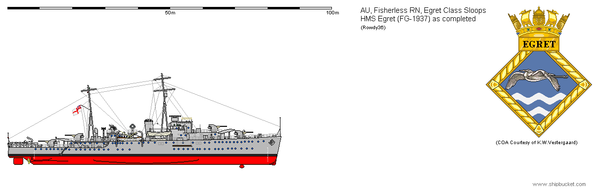 The three Egret class were a response to what had happened to ships in the Spanish Civil War. Those ships caught at sea with inadequate AA or no fighter cover just got hammered. The accuracy of the JU-87 meant many ships went to the bottom. The Egret, with its four twin 4" AA guns, had a very good barrage armament, but their close in armament of the one quad 0.5" machine gun mounting was very poor. WW2 upgrades with 20mm and later 40mm weapons improved this. All the electronic toys added during the early 40's meant that topweight became an issue and this was solved by removing 'Y' 4" mounting. The ships ended up looking like the Bitterns and Swans.