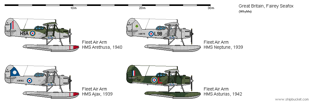 The Swordfish, Walrus and Seafox were the standard shipborne aircraft on the