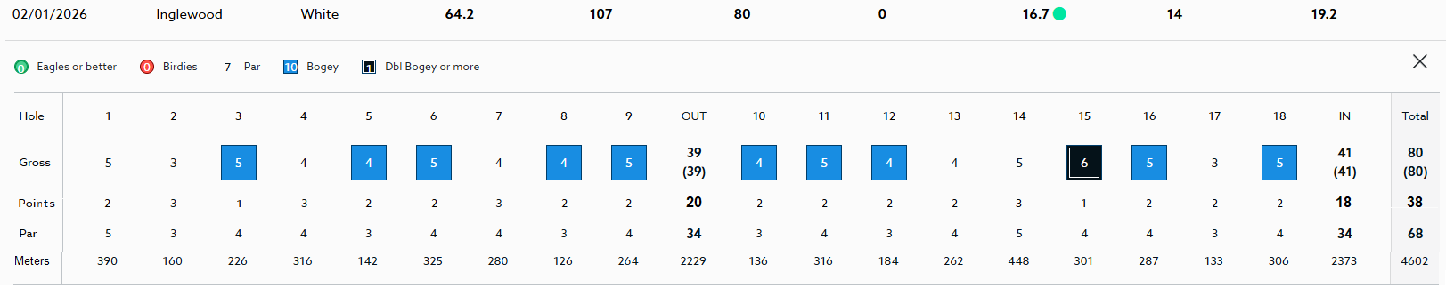 38 point total. Two under my handicap, so pleased with the result, but, it was a