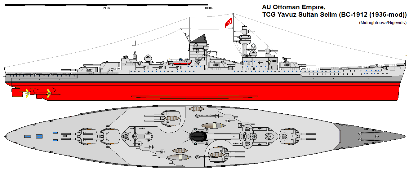 The Yavuz had been repaired as far as it was possible to do so with the limited resources of the Turkish port facilities. While seaworthy, the ship was only operating at about 80% of its capabilities. This state of affairs remained till 1933 when funds were made available to send the ship off to Germany for a badly needed rebuilding. The Germanic States, courting allies, made sure that the cost to the Ottoman Empire was only about 60% of the actual value of the work done. The Germanic States showed the Turkish Navy the plans of the upgrade to the battlecruiser Seydlitz (which was of the same layout as the Yavuz) but the Turks turned this down as they had no need of long range raider vessels. The Turks wished to retain as large a broadside as possible while improving the secondary and later anti-aircraft armaments. Improved fire control systems were also to be upgraded. The wing turret system while workable did cause strain on the decks when the 'offside' turret was fired across the deck through the blast effects. Other problems identified with these ships were the mounting of the 5.9" guns at main deck level which became useless in any sort of seaway and the 'plunging' of the bow in the same sort of seaway which made fire control difficult. The rebuilding (as shown above) removed the bow and forward submerged torpedo tube allowed for a new bow section to be fitted which with the added buoyancy stopped the plunging and allowed the ship to maintain speeds in heavier seaways than possible previously. The removal of the main deck 5.9" and their plating over gave the hull a much more streamlined effect. Half of the 5.9" guns were resited one deck up in new casemate mountings as the Turks wished to keep an anti-torpedoboat capability. Sited above these weapons were the heavy anti-aircraft guns, six single 88mm guns. Four twin 37mm and six single 20mm guns were fitted for the light AA armament. Other alterations included the change from coal fired to oil fired boilers, the rebuilding of the superstructures to take the new fire control gear and new weaponry placements, and not least the trunking of the funnels together into a new funnel arrangement. The return of the Yavuz in 1936 allowed the Kanuni to be sent to Germany for its refit from whence it returned in late 1938. The only difference between the two ships rebuilding being the fitting of four twin 4.1" turrets in place of the six single 88mm guns. Both ships from 1940 onwards received many extra twin and single 20mm AA guns and eventually the twin 37mm were replaced with twin 40mm of a much newer model.